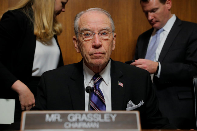 共和党参院司法委员会主席葛拉斯理主持27日的听证会,展现强势风格。(路透)