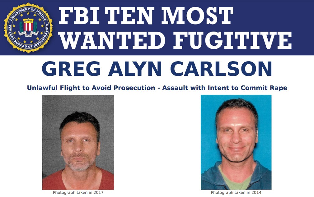 联邦调查局公布,现年46岁的卡尔森(Greg AlynCarlson)于2017年7月13日在洛杉矶入室盗窃,并使用武器威胁强奸了一名妇女。2017年9月卡尔森被捕面临指控,他在交保出狱后逃离洛杉矶。