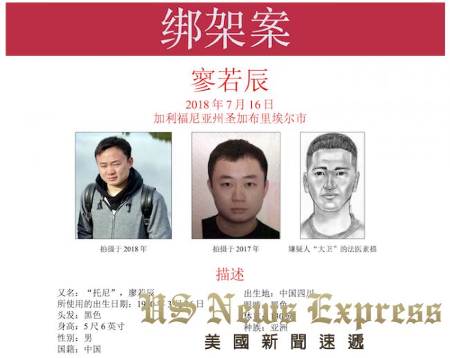 FBI悬赏寻找被绑架的廖若晨。(来源: 美国新闻速)