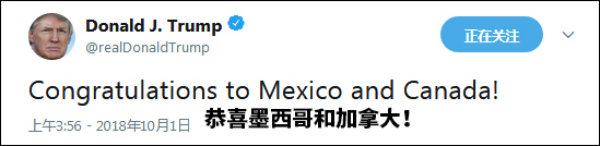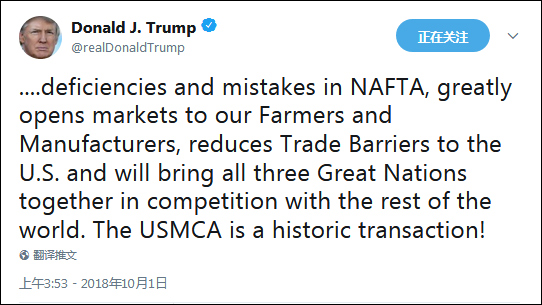 对“美加墨协定”十分满意的特朗普当天连发了几条推特,“USMCA解决了NAFTA中如此多的缺陷和错误,为我们的农民和制造商极大地打开了市场,减小了美国面临的贸易壁垒,将使这三个国家更加紧密地与世界其他国家展开竞争。USMCA是一项历史性交易!”