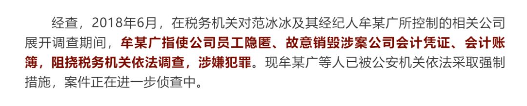 范冰冰虽然“安然无恙”,但其经纪人牟恩广的行为却令人产生无限遐想。根据报道,牟恩广,也即穆晓光,因指使员工隐匿、故意销毁公司会计凭证、会计账簿,阻挠税务机关依法调查,涉嫌犯罪,目前已被公安机关依法采取强制措施。