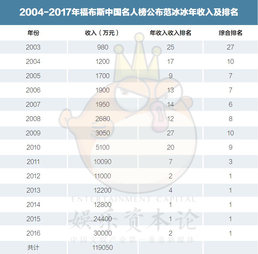 “百亿”的说法未免太过夸张,小娱整理了范冰冰自2004年登陆福布斯名人榜以来的年收入发现,2011-2016年间,范冰冰每年收入超过1亿元,连续5年位列福布斯中国名人榜综合排名第一;2016年范冰冰的收入高达3亿元,超过当年7成A股公司净利润。