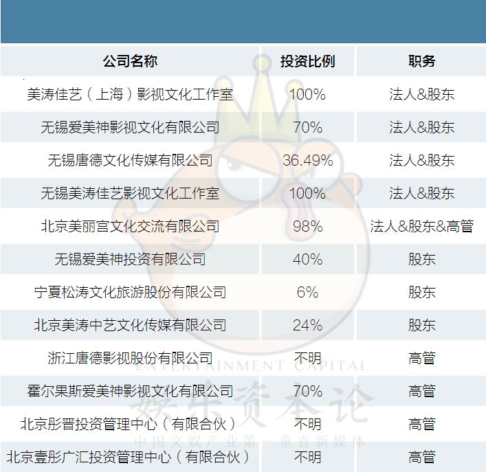 天眼查数据显示,范冰冰旗下共有12家公司,其中担任法人职务的就有5家。主营投资业务的公司中,目前仅保留了无锡爱美神投资有限公司,其他两家投资公司分别于2017年底和2018年初退出自然人股东名单。