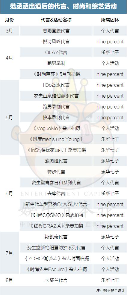出道不到一周时间,范丞丞便在微博宣布成立个人工作室。借力NINE PERCENT、乐华七子和范冰冰三股资源,范丞丞在代言、时尚活动、音乐、综艺活动等演艺事业方面开花,人气指数甚至一度超过nine percent的C位蔡徐坤。