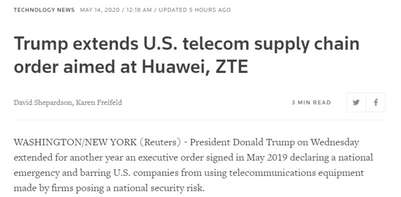 5月14日,据路透社消息,唐纳德·特朗普总统周三将2019年5月签署的行政命令延长了一年,该命令宣布发生国家紧急状态,并禁止美国公司使用构成国家安全风险的公司制造的电信设备。