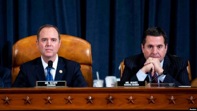 美众议院情报委员会的主席希夫(左)与该委员会的资深共和党成员努涅斯在一个听证会上(资料照)。