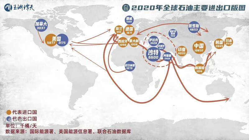 ▲图中进出口数据为2022年3月22日美国能源信息署统计的最新数据,展示了2020年全球石油进出口排名前十位的国家。线条粗细表示该路线石油运量的多少