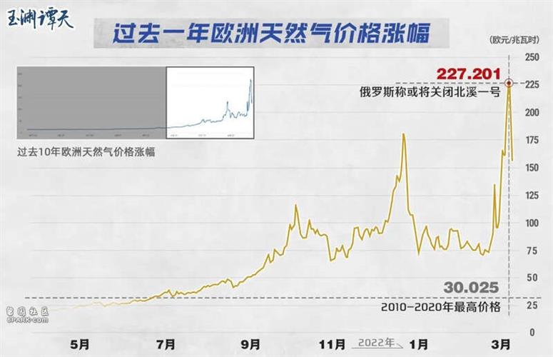 俄罗斯控制着欧洲约45%的天然气供应,同时掌控欧洲大约25%的石油供应。禁运俄罗斯能源的风声一出,就已经在欧洲能源市场中引发了“地震”。在美国对俄罗斯能源宣布制裁后,俄罗斯称或将关闭“北溪一号”。当天,欧洲天然气价格立刻飙升到227.201欧元/兆瓦时,是2010年至2020年间最高价格的7倍。