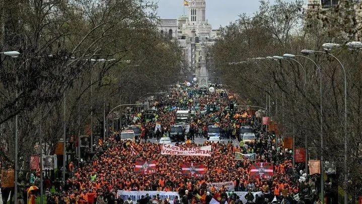 ▲ 在西班牙马德里,15万名市民高举着“成本继续上升” “我们农场主已经走在灭绝的路上了”的标语