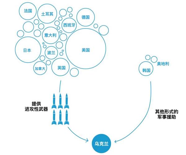 美国及其伙伴国家向乌克兰直接输送的致命武器和军事装备越来越多。它们还试图通过出口管制禁止许多企业向俄罗斯出售关键技术,从而切断俄罗斯自身的军事装备供应。在这些武器的帮助下,乌克兰出乎全世界意料地顶住了更强大的俄军的进攻。至少有40个国家向乌克兰提供了军事援助,包括运送进攻性武器和其他形式的军事援助。