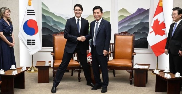 近日加拿大和韩国之间进行了外交会谈,而一张会谈的照片引起了人们的好奇。为庆祝两国外交关系建立60周年,特鲁多访问了韩国,旨在加强两国之间的关系,促进两国经济的增长。作为访问的一部分,他会面了韩国国会议长金振杓。