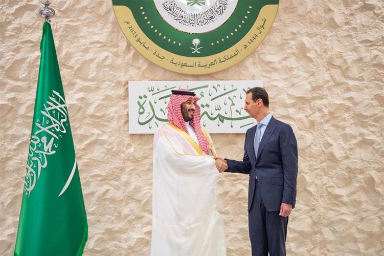 5月19日,在沙特阿拉伯吉达,沙特王储兼首相穆罕默德(左)在第32届阿拉伯国家联盟首脑理事会会议(阿盟峰会)召开前的欢迎仪式上与叙利亚总统巴沙尔握手。新华社发(沙特阿拉伯通讯社供图)