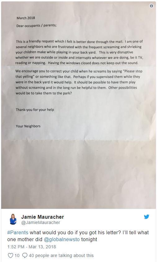 多伦多一名有四个儿子的母亲近日接到邻居的匿名信,称她家孩子在后院太过吵闹,请她制止孩子喊叫。这位母亲把邻居的匿名信放在网上,Global times的记者随后前往了解调查。