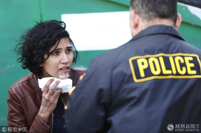 嫌犯戴着头巾,是个成年的白人女性。图为现场民众。