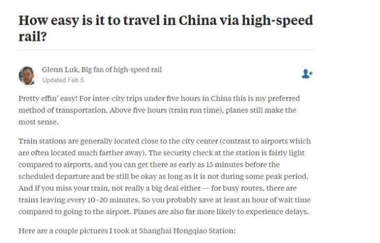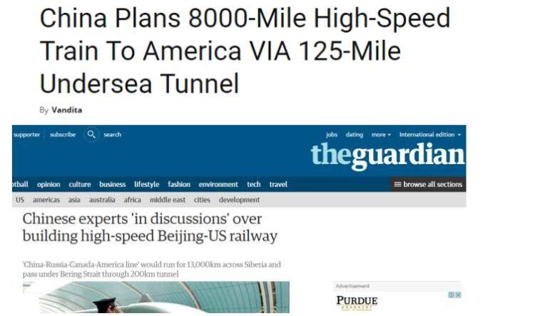 尤其是中国的高铁,已经成为展现魅力中国的一张名片。据报道,中国拟建一条全程约1.3万公里的中美洲际高铁(途径加拿大),届时从中国到加拿大只需要一天。 列车将从中国东北出发,一路向北途经西伯利亚、白令海峡,从海底隧道穿越太平洋抵达阿拉斯加、加拿大,最终抵达美国。 这么酷炫的大工程,估计也只有中国能够做到了! 海外媒体已经开始争相报道这一盛事。 攻克技术难关 建设海底隧道 洲际高铁的难点之一是海底隧道的建设,而这并不是天方夜谭。但论高铁技术,中国不仅有成熟先进,还已经做好了规划。早在2014年,中国工程院院士、著名铁路专家王梦恕接受记者采访时,介绍了修建跨境高铁线路的具体进展。 在国外问答网站上也出现了关于中国高铁的问答,用户都对中国高铁给与了很高的评价,认为中国高铁既安全快速有便宜实惠。 或许在不久的将来,中国的海底高铁就会成功建成,到时就可以一起见证高科技带来的酷炫。