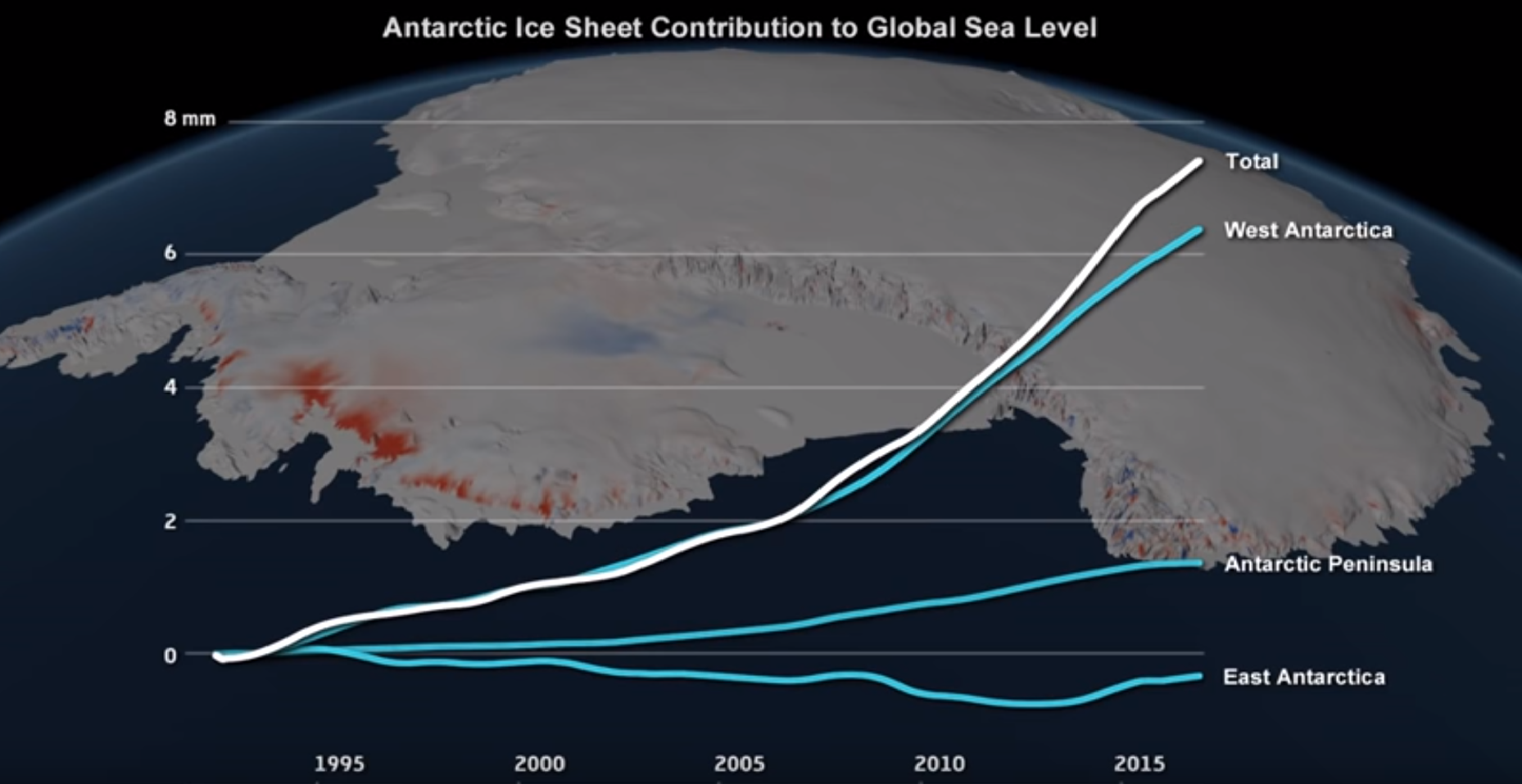 根据研究报告,从1992年到2015年,南极冰盖融化造成地球海平面上升了8毫米,平均每年0.6毫米。