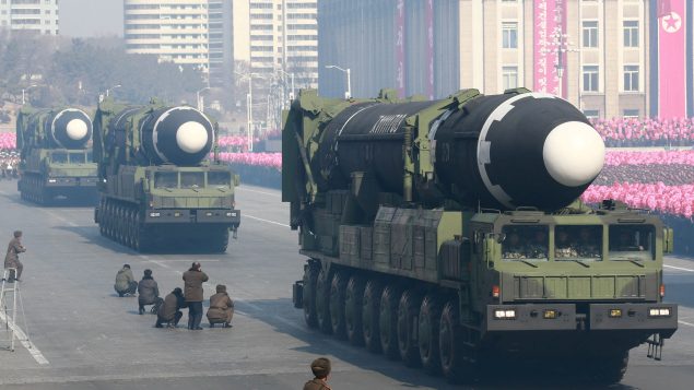 2018年2月9日朝鲜庆祝建军70周年阅兵时展示的弹道导弹(KCNA/via REUTERS)