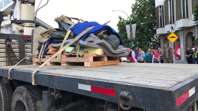 被拆除后准备运走的麦克唐纳雕像。(Radio-Canada / Megan Thomas)
