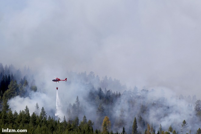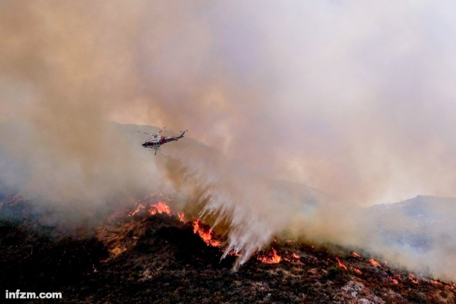 8月11日,在美国加利福尼亚州洛杉矶东南部的埃尔西诺湖地区,一架直升机参与灭火。(新华社/法新/图)