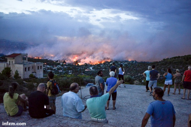 7月23日,在希腊雅典附近的拉菲那镇,人们在观望火情。(新华社/法新/图)