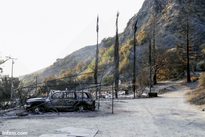 8月9日,在美国加利福尼亚州北部莱克县,一辆车被大火烧毁。在加州北部的门多西诺县、科卢萨县和莱克县境内燃烧的“门多西诺联合山火”由“牧场山火”和“河滨山火”两场邻近山火共同构成。(新华社 董旭东/图)