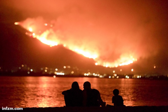 8月9日,在美国加利福尼亚州埃尔西诺湖地区,一家人坐在岸边观看燃烧的山火。(新华社/美联/图)