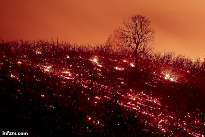 8月5日,在美国加利福尼亚州克利尔莱克奥克斯附近,山坡上火光闪烁。(新华社/法新/图)