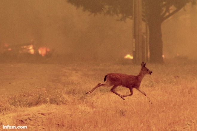 8月4日,在美国加利福尼亚州克利尔莱克奥克斯附近,一只小鹿奔离火场。(新华社/法新/图)
