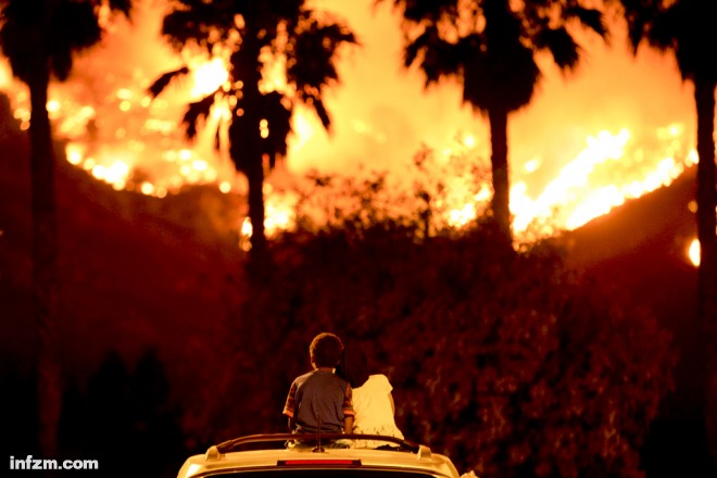 8月9日,在美国加利福尼亚州埃尔西诺湖地区,一对兄妹坐在车顶观看燃烧的山火。(新华社/美联/图)