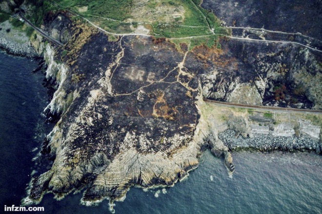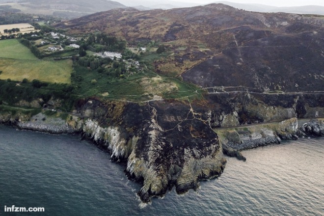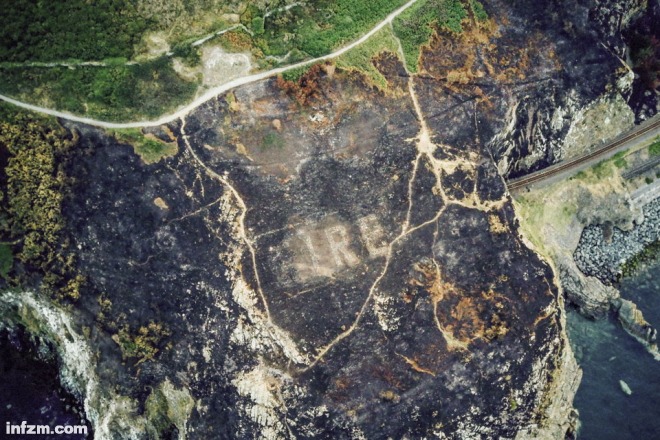 爱尔兰警方提供的照片显示,在布雷县的一个沿海山坡上,4个巨大的白色字母“EIRE”(即爱尔兰)在森林被燃烧殆尽之后露出地表,在字母的右下方有一个数字“8”的字样。
