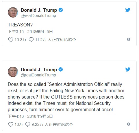 特朗普则指,这个不署名的作者是“没胆量”,并且说《纽约时报》是“虚假”报道。