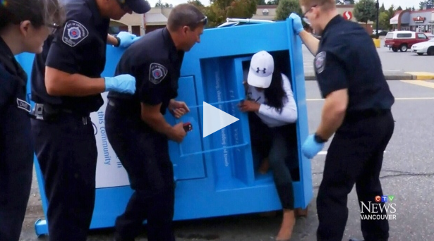 Jared Harms告诉CTV温哥华,星期天早上他看到一名男子将这名妇女提进了捐赠箱,位置在卑诗省Abbotsford一家商场外。
