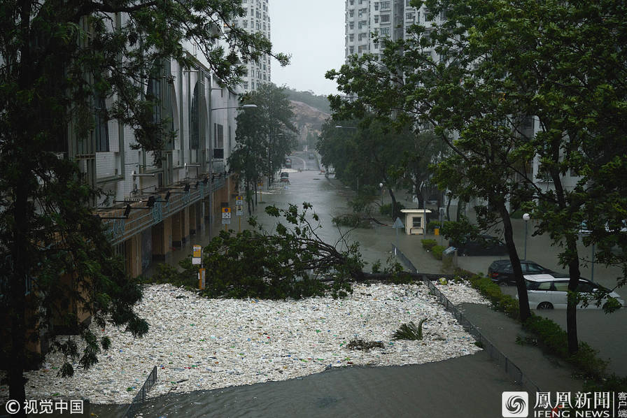 香港杏花邨,台风“山竹”致海水倒灌,住宅区被水淹没,大量垃圾被冲入小区。