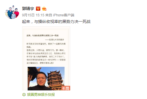 9月15日,导演郭靖宇发布了一篇名为《起来,与操纵收视率的黑势力决一死战》的长文,并引发关注。
