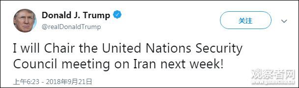 早在21日,特朗普就“迫不及待”地发推特做预告:下周!我会主持联合国安理会伊朗方面的会议。