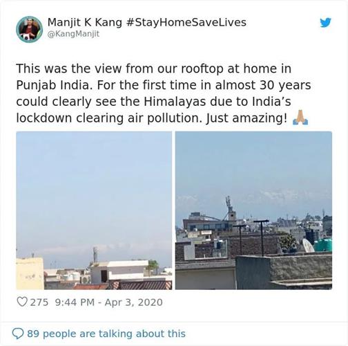 “我从来都没有在家里见到过喜马拉雅山脉,根本不敢想象这居然发生了。这也清楚地表明我们之前对自然的污染到底有多严重。”
