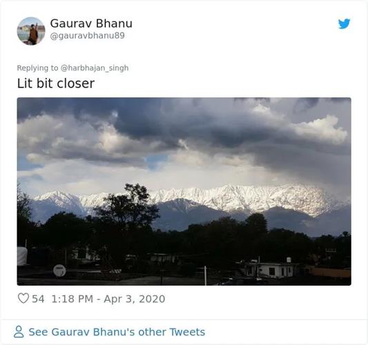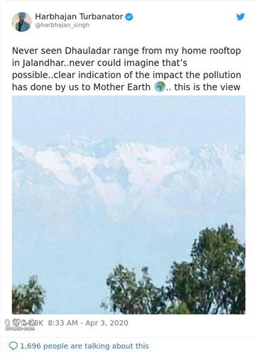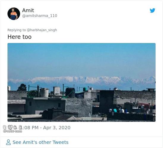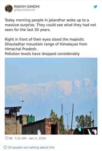 “这是从我们家屋顶拍到的照片,因为印度的封锁禁令,空气污染都好了,这几乎是喜马拉雅山脉30年来头一次被清楚看到。”