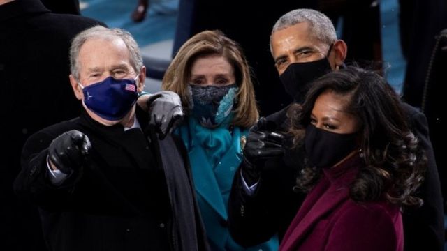 戴了口罩还能认出来吗?从左到右,美国前总统乔治·布什、众议院议长南希·佩罗西、前总统巴拉克·奥巴马、前第一夫人米歇尔·奥巴马