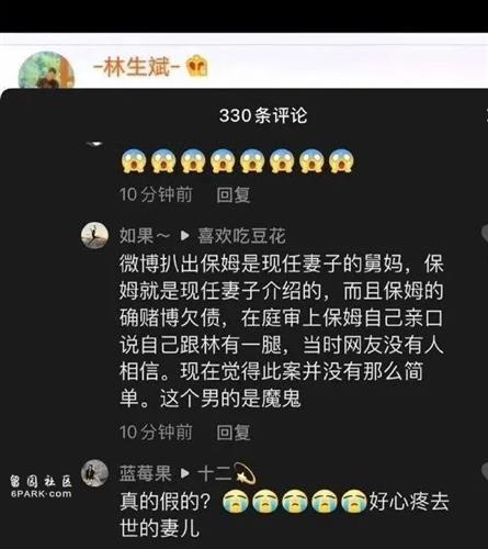 在林生斌微博下面,有一条这样的评论:微博扒出保姆是现任妻子的舅妈,保姆就是现任妻子介绍的,而且保姆的确赌博欠债,在庭审上保姆自己亲口说自己跟林有一腿,当时网友没有人相信。现在觉得此案并没有那么简单,这个男的是魔鬼。