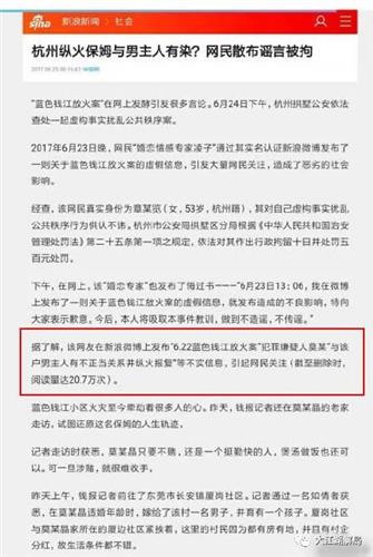其实,这个传言早已有之,在纵火事故发生后两天,就有网友散布男主人与保姆有不正当关系并纵火报复的谣言,并且这名网友还被杭州公安局拘留了十天。