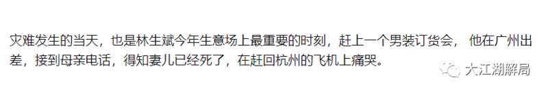 为了增加剧情的狗血程度,上面那篇自媒体文章还说:但是如今已经有很多人知道,出事的那一天男主人公在小三那里,这样的巧合让人生畏。这句话同样是没有来源和出处,只是“已经有很多人知道”一笔带过,把谣言说成既成事实。事实上,在“每日人物”对林生斌采访的《纵火案后,林生斌的日与夜》中,可以知道,出事那一天,林生斌在广州出差,参加一个男装订货会。