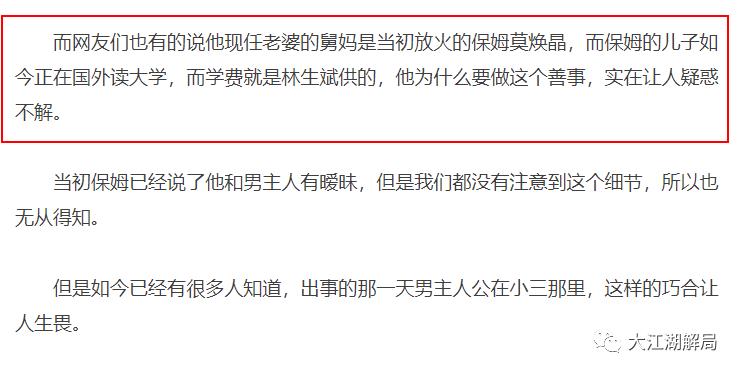 林生斌接到母亲的电话,才知道妻儿已经死亡,坐飞机回到杭州。从莫焕晶的判决书可以知道,火灾故事发生的时候,朱小贞没有联系上过林生斌,她一直在打报警电话,直到昏迷的那刻,还在与120沟通情况。这些谣言结合在一起,勾勒了这样一个恶毒的故事:林生斌养了小三,还与保姆有一腿。为了与小三在一起,林生斌与保姆达成协议,以后把她的小孩送到国外读书,让她在自己家里放火,把妻子和三个孩子全部烧死。