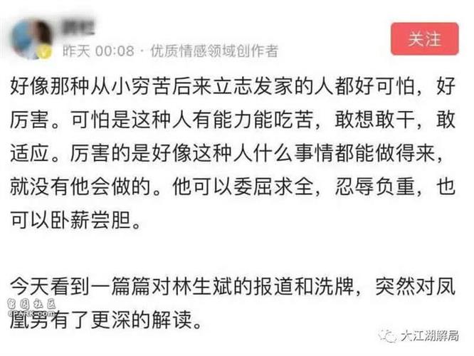 凤凰男有的一些优点,比如:吃苦耐劳,忍辱负重,一夜之间,全部变成了可怕之处。事实上,林生斌只是高中毕业,并不是从农村吃苦考过来的大学生。说林生斌是凤凰男,这一点站不住脚;拿林生斌作为案例,指责凤凰男的原罪,也是无稽之谈。