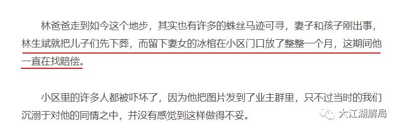 有的网友说,林生斌将妻女惨死的照片,发到群里面,以此给物业施压。还有网友说,林生斌将妻儿尸体放在烧毁的房子里面,不让搬走,就是为了索赔。造这种谣言的人,不是他的脑袋大大的坏了,就是以为读者的脑袋坏了,再一次侮辱读者的智商。