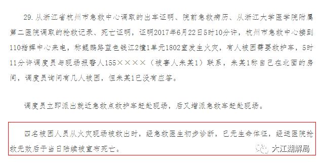 在莫焕晶的判决书上写得非常清楚,“四名被困人员从火灾现场被救出时,经急救医生初步诊断,已无生命体征,经送进医院抢救无效后于当日陆续被宣布死亡。”