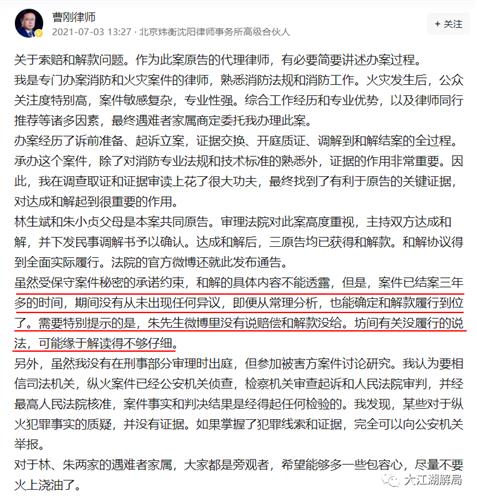 对于赔偿款的问题,林生斌和朱小贞父母的共同代理律师曹刚发表了他的看法,他说:虽然受保守秘密的承诺约束,和解的具体内容不能透露,但是,案件已经结案三年多的时间,期间没有从未出现任何异议,即便从常理分析,也能确定和解款履行到位了。需要特别提示的是,朱先生微博里没有说赔偿和解款没给。