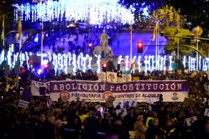 2019年11月25日,在马德里举行的“消除对妇女暴力国际日”纪念活动中,妇女们举着写有“废除卖淫”字样的巨大横幅。
