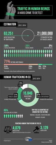 欧盟最近一次的打击人口贩运的报告,统计了2017年-2018年的数据(《第三份关于打击人口贩运取得进展的报告》)。在两年内,欧盟成员国登记的贩运受害者总数为14145人,比上一个统计周期增加了684人。而在每一次统计报告中,在登记受害者人数之后,总会补充一句:“由于许多受害者没有被发现,实际受害者人数可能比报告的数据要高得多。”