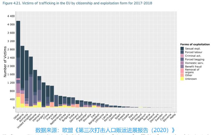 非欧盟国家受害者数量及其遭遇的剥削形式(图源:欧盟《第三次打击人口贩运进展报告》)