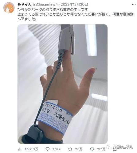 当天晚些时候,女游客在医院里缓过神来后,跟网友分享了被困50米高空4小时的感受。“我就是被困枚方游乐园的本人。卡在上面的期间,我其实没有什么害怕或愤怒的情绪,单纯只是冷到受不了,好几次都失去了意识。”